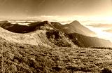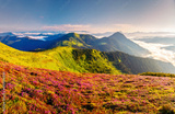 Splendid landscape in sunny summer day with pink rhododendron flowers. Carpathian mountains, Ukraine.