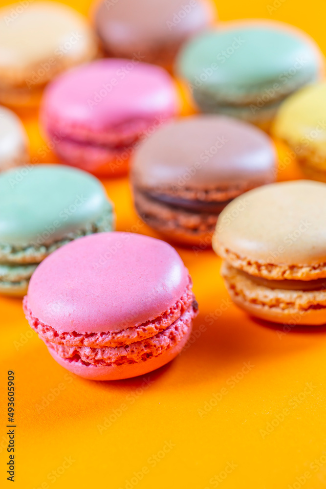 Close-up of macarons cakes of different colors .Culinary and cooking concept. Tasty colorful macaroons.