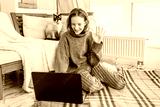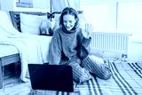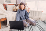 Smiling female student looking at laptop screen waving hand greeting tutor.