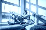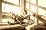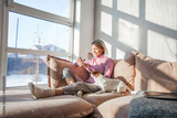 Girl lying on sofa holding phone in her hands in an white sweater on sofa
