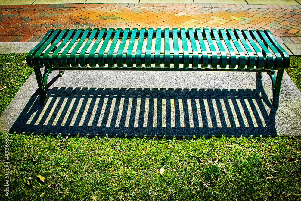 Green metal park bench on concrete slab by brick sidewalk with dramatic shadow