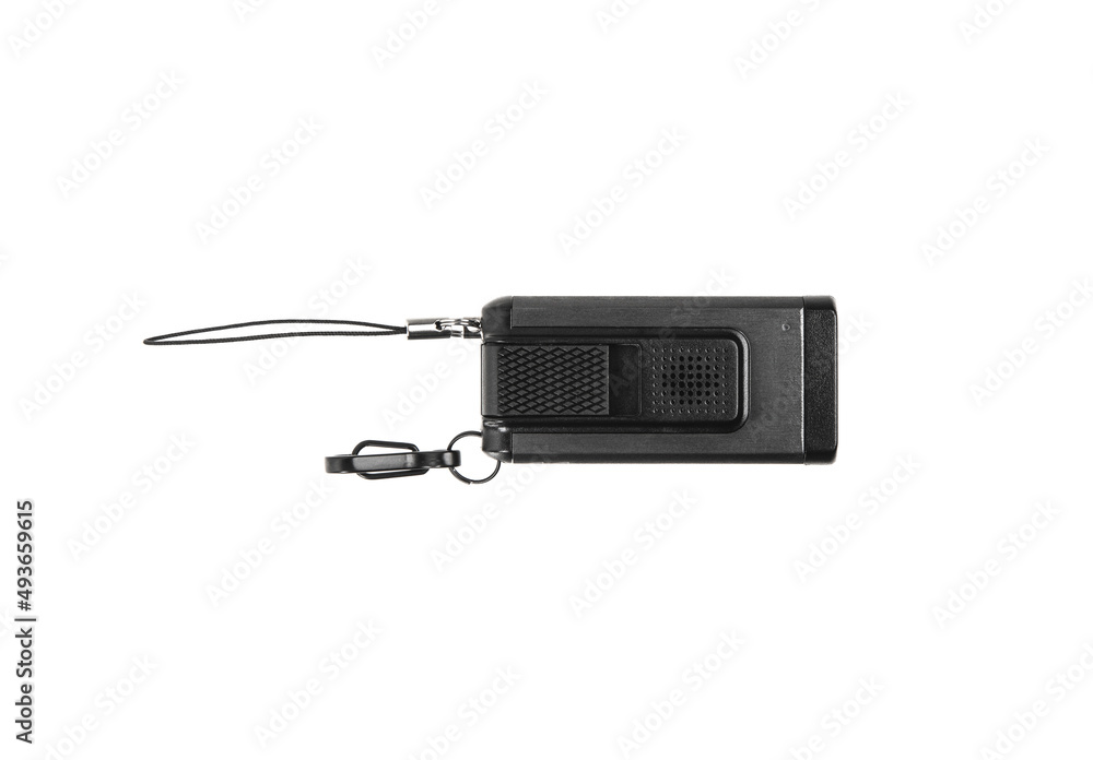 Black metal LED flashlight isolate on a white back. Pocket lamp for dark time of day or dark rooms.