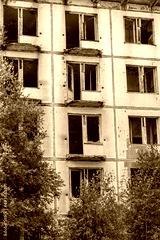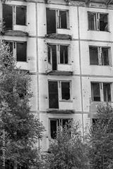 A damaged abandoned panel house with decorative facade of small white tiles.