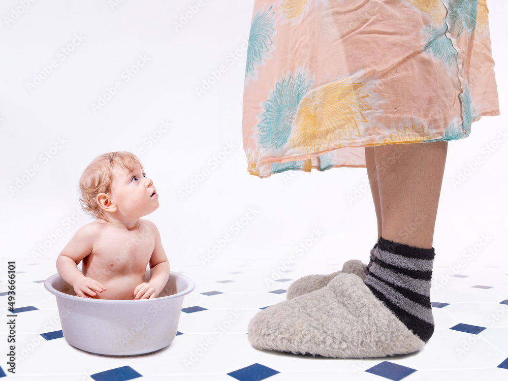 A frightened child sits in a plastic sink and looks at a large person standing over him