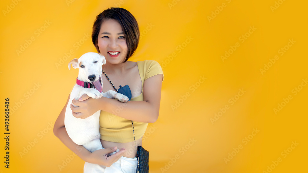 woman with jack russel puppy , embraces with love dog,