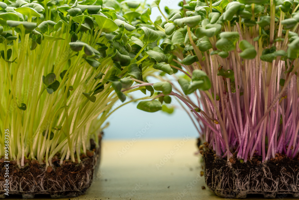 Purple and daikon radish on organic soil. Radish microgreens, Front side close up