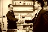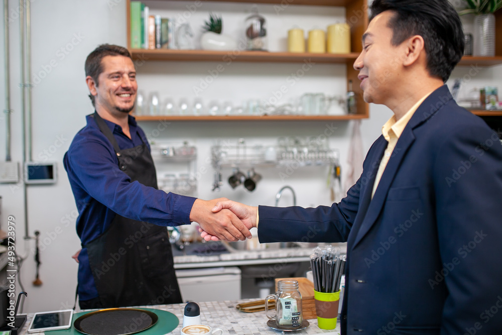 happy barista take order from customer in coffee shop. restaurant owner and customer shake hands.