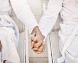 We are stuck together my dear. Shot of two unrecognizable people holding hands while relaxing in bathrobes outside at a spa during the day.