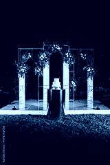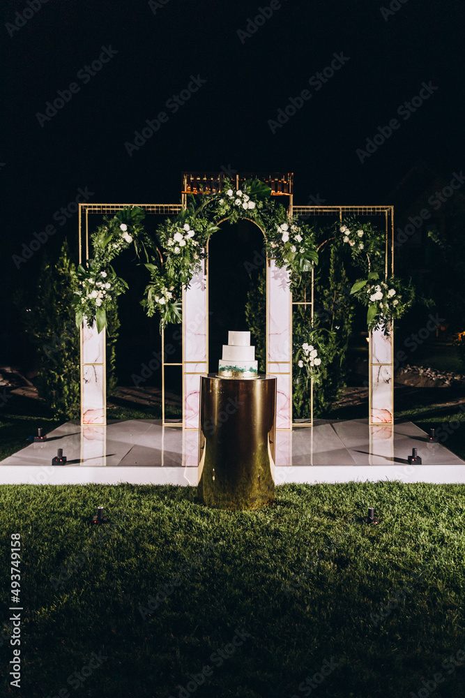 A white wedding cake stands on a transparent table against the backdrop of decorations, which are decorated with compositions of flowers and greenery.