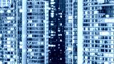 A city office building with lights on at night