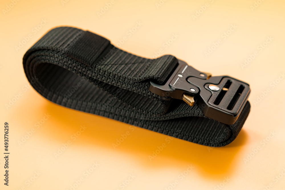 A black canvas belt fitted with a black metal male buckle and a black belt loop lays on the orange background. Tape. Fix. Navy. Martial. Troop. Naval. Service. Force. Strap. Black