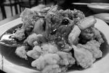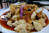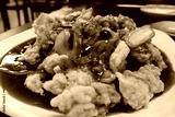 sweet and sour pork topped with sauce on a round plate