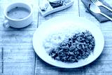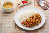 Stir fried pork and basil,fry minced pork and basil with oyster sauce in white plate with cooked thai jasmine rice,famous food in Thailand(khao kaprao moosub)