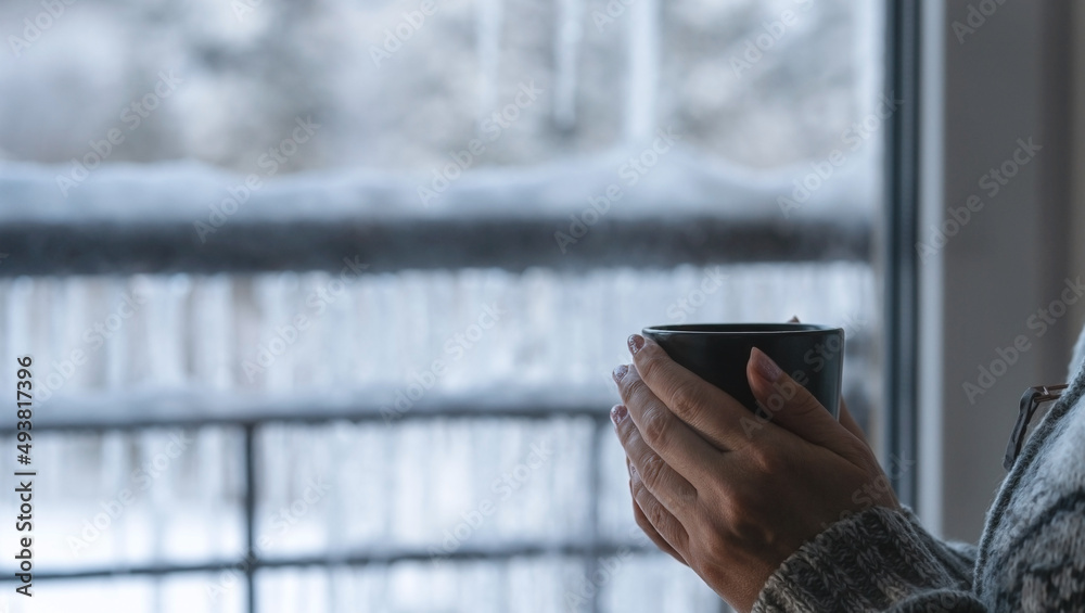 She holds and warms her hands over a cup of hot tea.Woman stands next to the window and looks outside during cold winter day