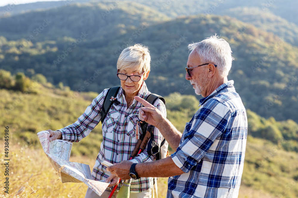 Mature couple in nature looking on map to find road to home