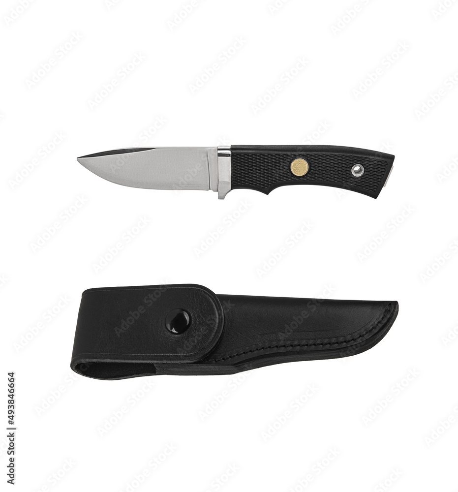 Modern hunting knife with silver blade and rubber handle. Steel arms. Isolate on a white back
