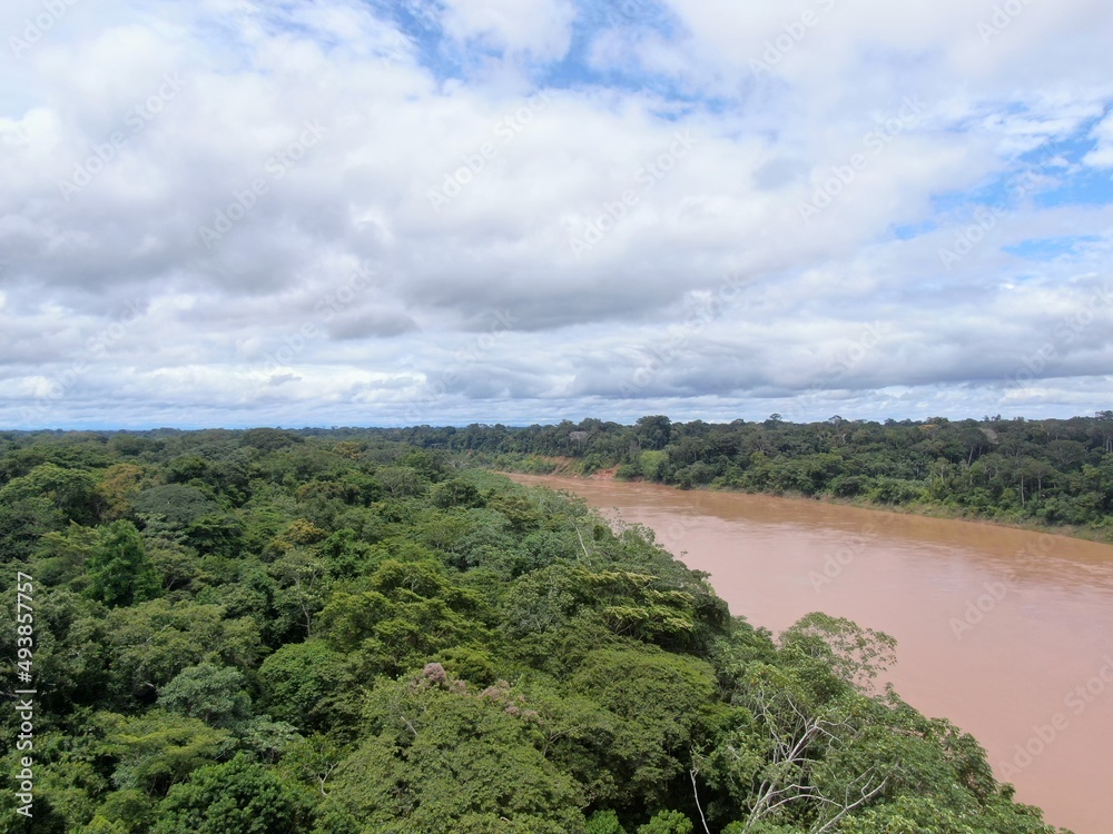 Drone picture of tambopata national park showing river flowing through rainforest