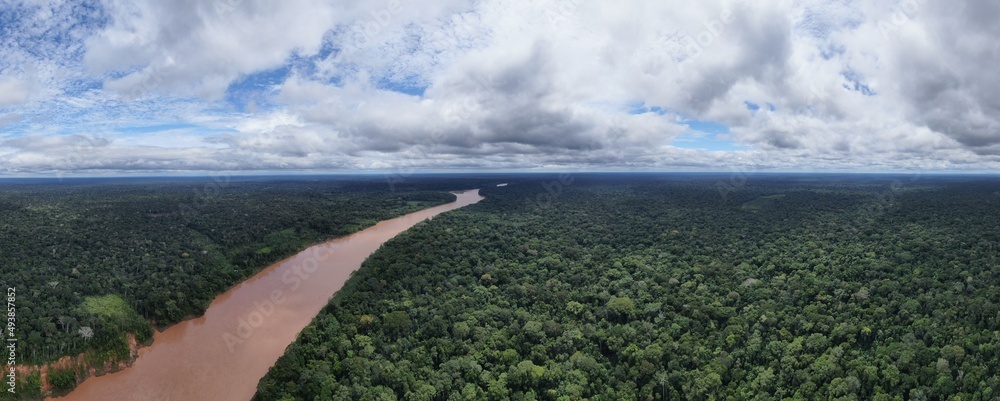 Panorama picture of tambopata national park showing river flowing through rainforest