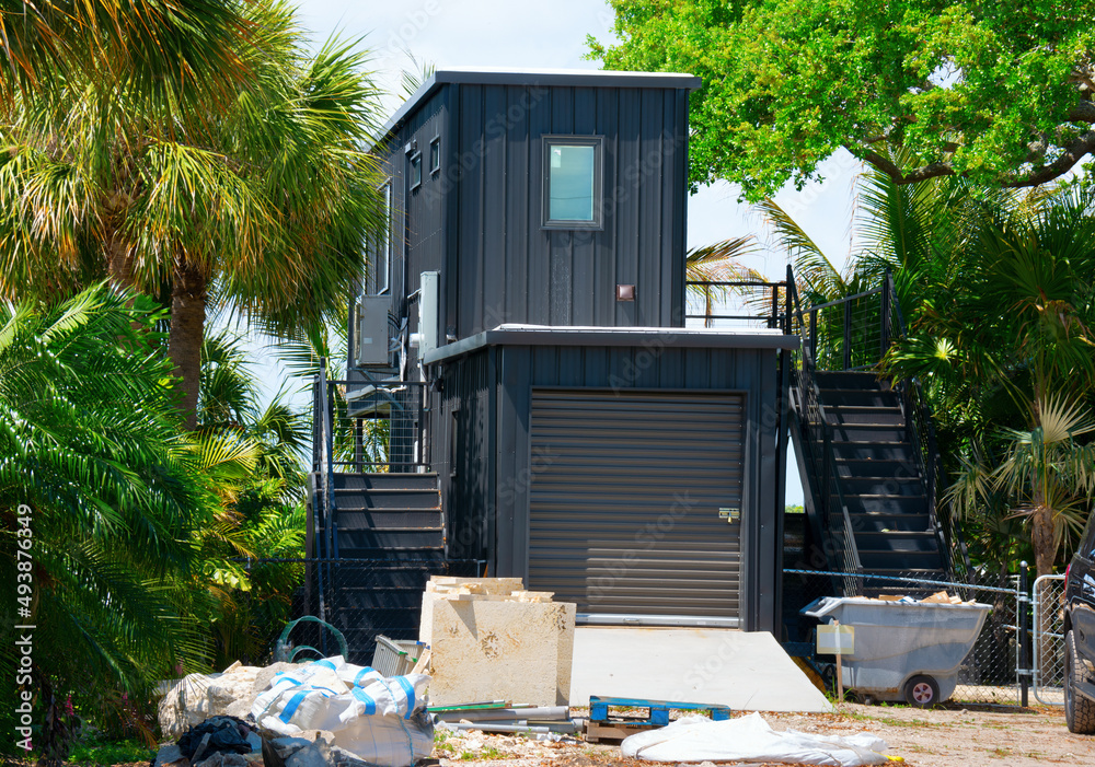 Metal shipping container house under construction with building material products in front yard on piece of land with lush green trees.