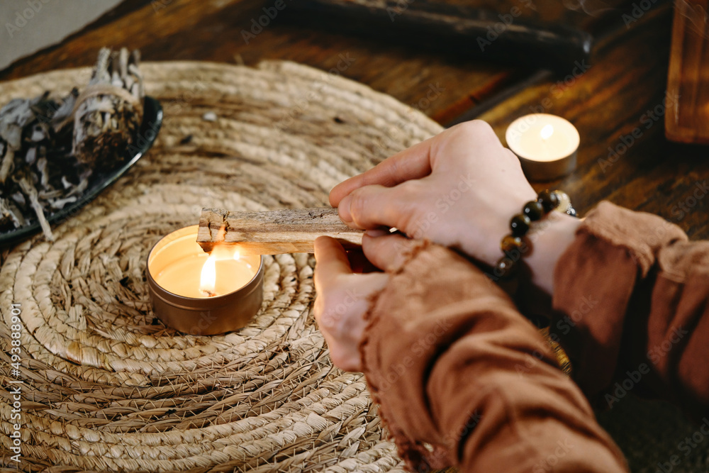 Woman hands burning Palo Santo, before ritual on the table with candles and green plants. Smoke of smudging treats pain and stress, clears negative energy and meditation wooden stick