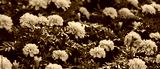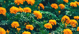 Banner with orange marigolds flowers Tagetes erecta, African, Mexican, Aztec marigold with green leaves in garden flowerbed. Summer and fall shades of yellow, orange blooming floral background