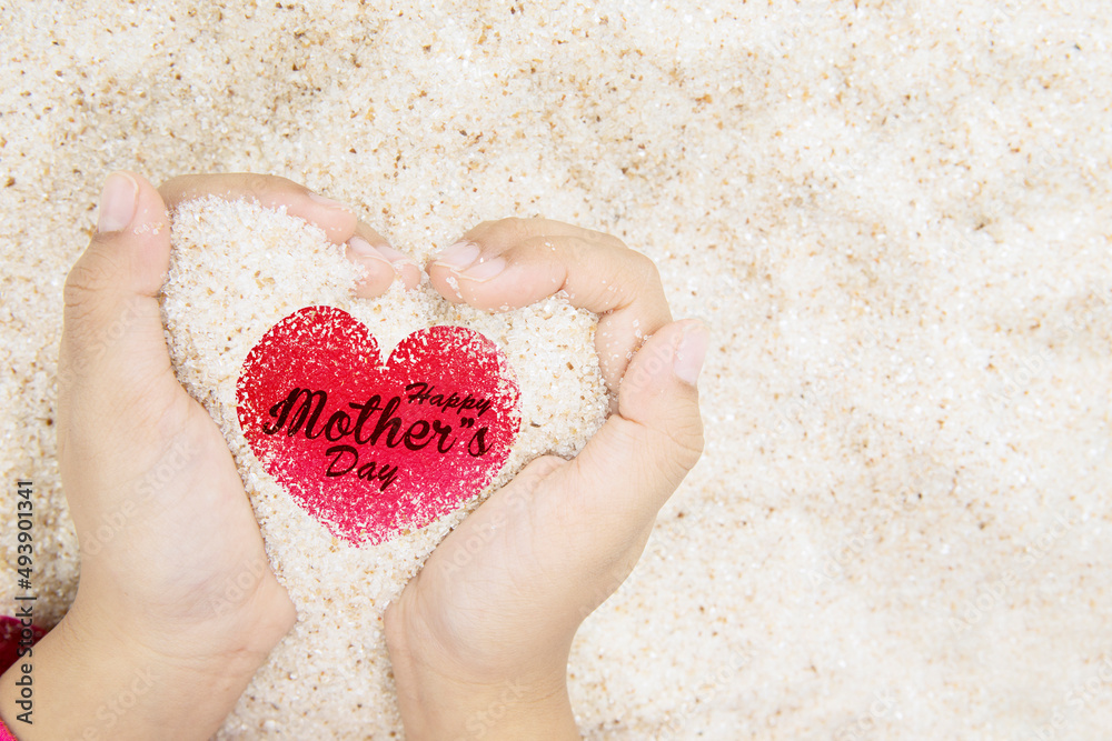 Child hands hold sand with happy mothers day text
