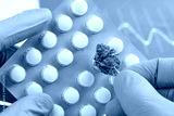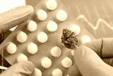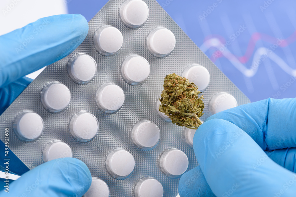 Scientist hold medical pills blister in one hand and CBD cannabis flower bud in other