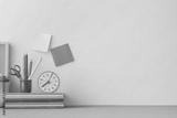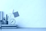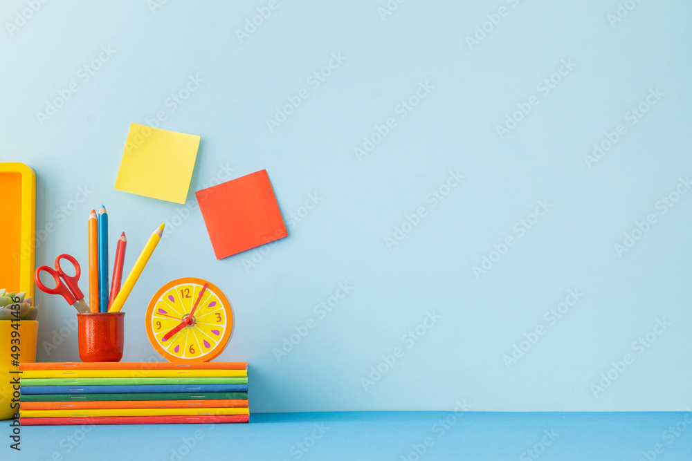Pastel blue mock up young student desk, with yellow supples, mannequin, notebook and copy space.