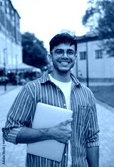 Authentic portrait of young handsome Indian man wearing stylish eyeglasses standing on the street. Smiling asian student holding laptop looking at camera in university campus. Education concept