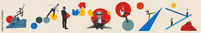 Contemporary art collage made of shots of young men and women, managers working hardly isolated over white background, Concept of business, finance, career