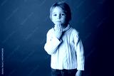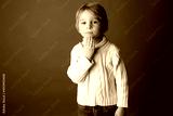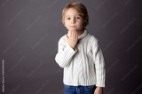 Cute little toddler boy, showing THANK YOU gesture in sign language on gray background, isolated image, child showing hand sings