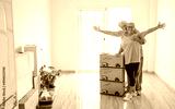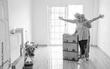 Smiling caucasian senior couple white haired open arms looking at camera during relocation, happy for the new beginning. Moving boxes on the floor, empty apartment