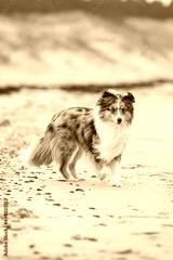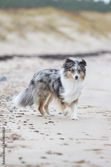 Blue merle shetland sheepdog walking near baltic sea on sand.
