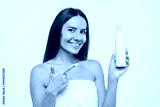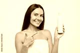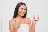 Attractive caucasian young woman lady girl pointing at beauty treatment bottle, shower gel shampoo for hair face skin care, hydration and rejuvenation isolated in grey background