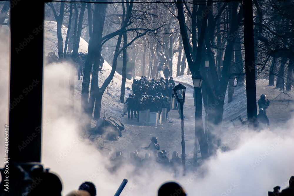 Police with shields to disperse protesters in Kyiv
