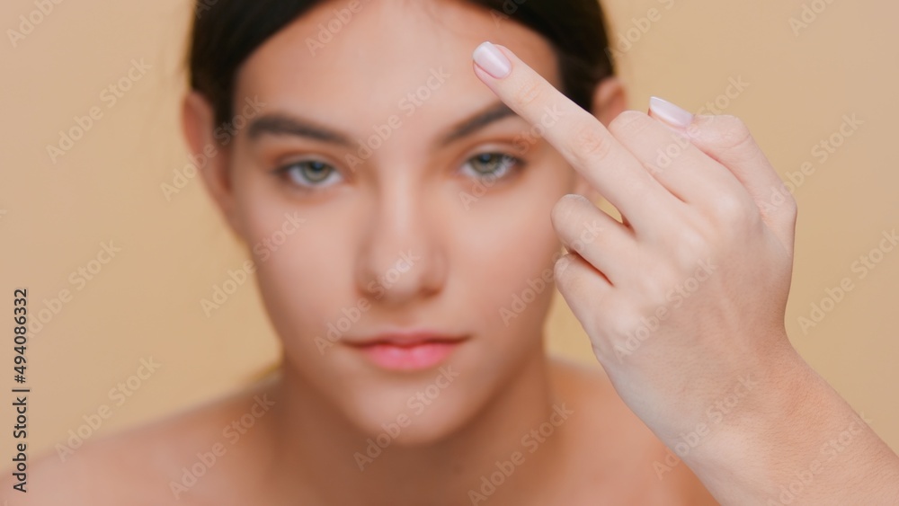 Close-up beauty portrait of young attractive woman shows a middle finger gesture at camera