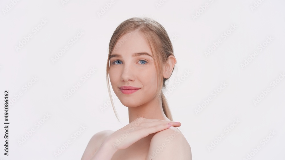 Close-up beauty portrait of young gorgeous light-haired woman sliding her hand down a shoulder looks at the camera and smiles on light grey background | Skin care product commercial concept