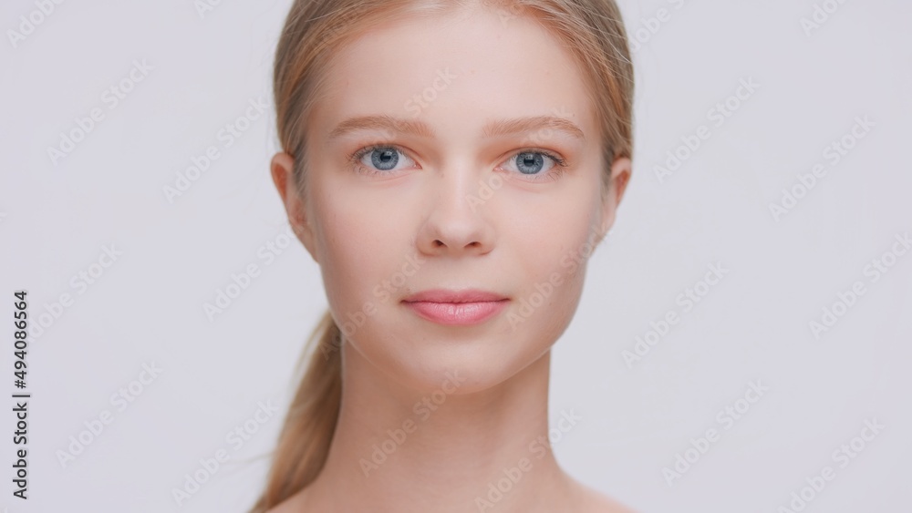 Young attractive blonde beauty model on grey background raise her head, open her eyes, looks at the camera and smiles | Beauty and skincare concept