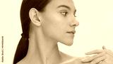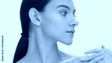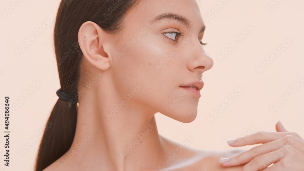 Close-up beauty portrait of young woman with a smooth skin. Girl softly strokes her clavicles | Body care and skin care concept.