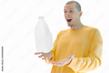 A gallon of milk flying above hands of surprised man isolated on a white background. White plastic. Appetite. Nourishment. Cuisine. Shop. Food. Eating. Calcium. Daily. Nutrient