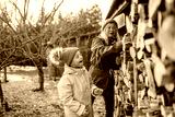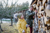 Boy with Down syndrome working in garden in winter with his grandmother.