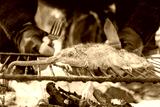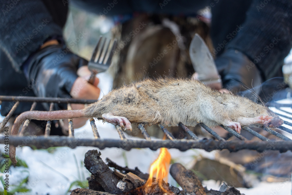 The homeless man with knife ad fork beside the grill of a rat, in a snowy landscape, close up view.