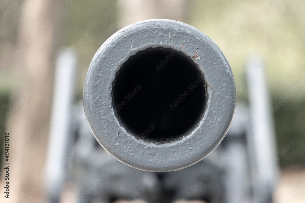 The barrel of the cannon aims front into a camera