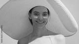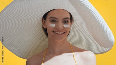 Young attractive dark-haired woman in a big white hat applies sunblock on cheeks and enjoys the sun smiling wide against yellow background | Sunscreen application shot for skincare commercial