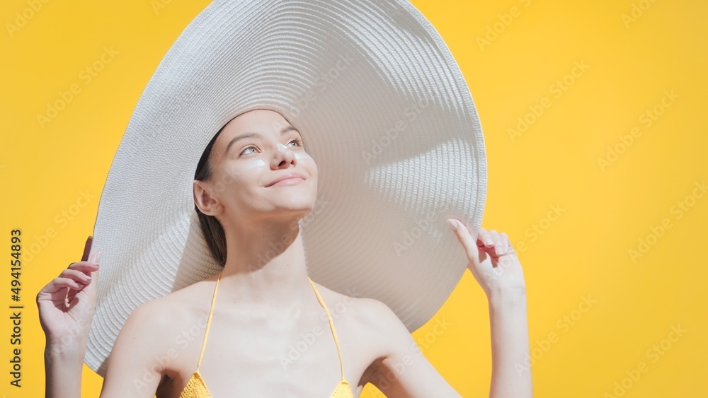 Young gorgeous brunette Caucasian woman in a big white hat with sunblock on her cheeks and nose enjoys the sun smiling against yellow background | Sunscreen commercial concept