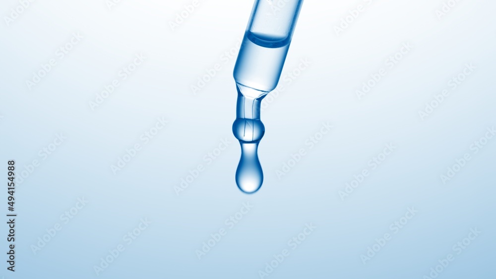 Drop of blue transparent fluid is falling down from lab dropper on purple background | Abstract face serum ingredients formulation concept