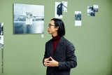 Serious professional art critic wearing eyeglasses standing in modern art gallery looking at black and white photos on wall at exhibition