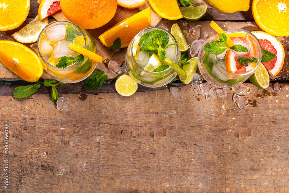 Summer healthy cocktails, mocktails. Set of various citrus lemonades mojito, with lime, lemon, orange, grapefruit, diet detox beverages