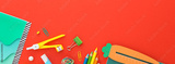 School background. School supplies on yellow background. Creative desk. Banner.