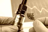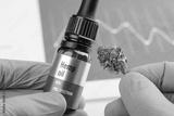 Scientist hold hemp full spectrum oil in one hand and CBD cannabis flower in other